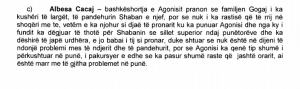 Edhe bashkëshortja e Agonisit, Albesa Cacaj, ka deklaruar se e kishte dëgjuar Agonisin të thotë për Shabanin se sillet superior ndaj punëtorëve dhe se ka dëshirë të jap urdhra.