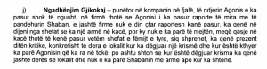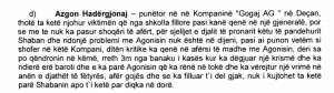 Atë ditë ajo kishte thënë se e kishte parë Shabanin me një revole me ngjyrë të bardhë e cila ishte pa karikator dhe se ai e kishte marrë e kishte raportirat dhe se e kishte drejtuar ka punëtorët që ishin pak para arkës duke bërë shaka dhe duke folur për bjeshkë dhe se në atë moment kishte dëgjuar një krismë të armës dhe e kishte parë Agonisin duke u rrëzuar për toke.