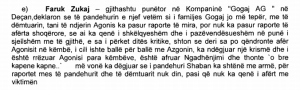 Edhe punëtori tjetër i kompanisë, Faruk Zukaj ka thënë se nuk di për raportet mes viktimës dhe të pandehurit, meqenëse s’ka qenë i afërt me të. Për ditën e vrasjes, ai thotë se se deri sa po qendronte afër Agonisit në këmbë, i cili ishte ballë për ballë me Azgonin, ka dëgjuar një krismë dhe i është rrëzuar Agonisi para këmbëve.