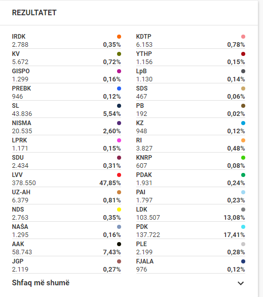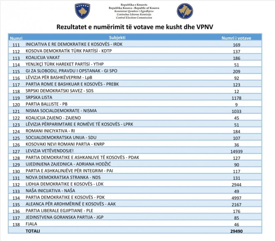 Numri i votuesve të numëruar – të rregullt dhe parregullt – është plot 820 mijë e 632. Ndërkohë që Vetëvendosje ka marrë 393 mijë e 489.