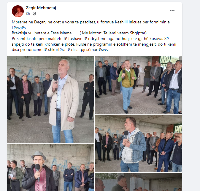 “Mbrëmë në Deçan, në orët e vona të pasditës, u formua Këshilli inicues për formimin e Lëvizjës Braktisja vullnetare e Fesë Islame ( Me Moton: Të jemi vetëm Shqiptar).Prezent kishte personalitete të fushave të ndryshme nga pothuajse e gjithë kosova. Së shpejti do ta keni kronikën e plotë, kurse në programin e sotshëm të mëngjesit, do ti kemi disa prononcime të shkurtëra të disa pjesëmarrësve”, ka shkruar Mehmetaj.