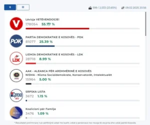 Janë procesuar mbi 23 për qind të vendvotimeve në zgjedhjet e përgjithshme të 9 shkurtit. Nga kjo përqindje e numëruar, Lëvizja Vetëvendosje prin me 55.77 për qind.